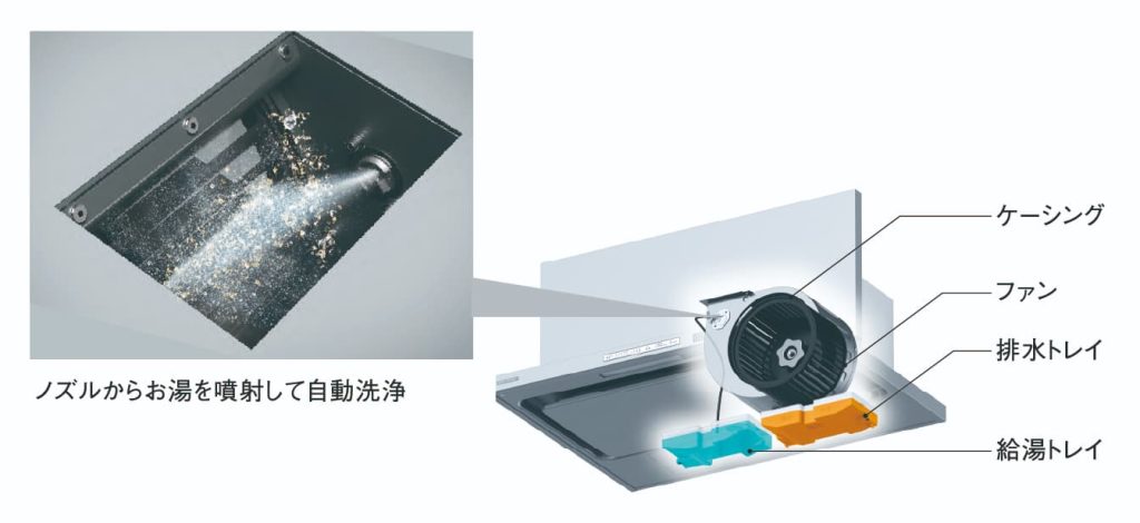 レンジフード内部とファンのお掃除が不要になり、時短と節水につながります。